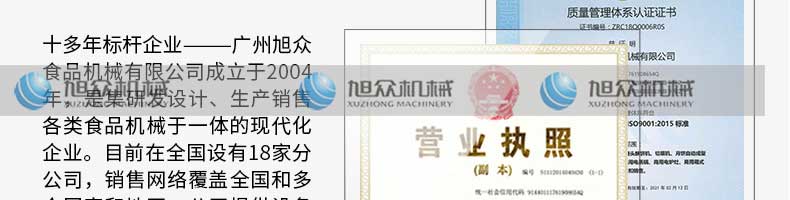 廣州旭眾食品機械有限公司是一家集科研開發(fā),生產(chǎn)設(shè)計,營銷服務(wù)為一體的現(xiàn)代化生產(chǎn)企業(yè)?,F(xiàn)代化生產(chǎn)車間,精湛制造技術(shù),所產(chǎn)機械歷經(jīng)市場重重考驗,不斷贏得海內(nèi)外客戶的贊譽。