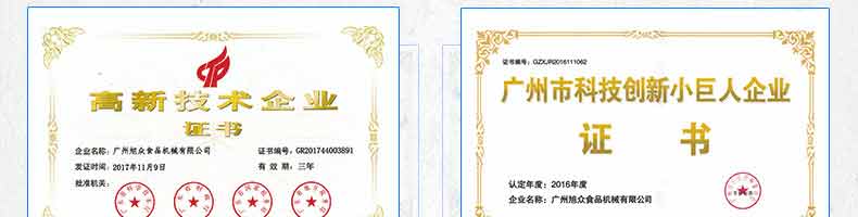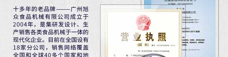 廣州旭眾食品機(jī)械有限公司是一家集科研開發(fā),生產(chǎn)設(shè)計,營銷服務(wù)為一體的現(xiàn)代化生產(chǎn)企業(yè)?,F(xiàn)代化生產(chǎn)車間,精湛制造技術(shù),所產(chǎn)機(jī)械歷經(jīng)市場重重考驗,不斷贏得海內(nèi)外客戶的贊譽(yù)。