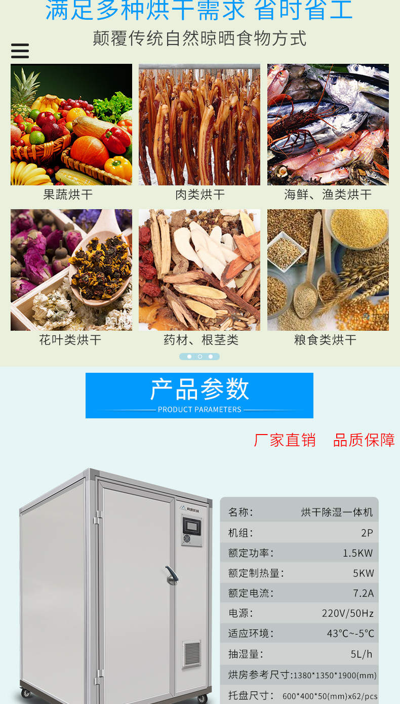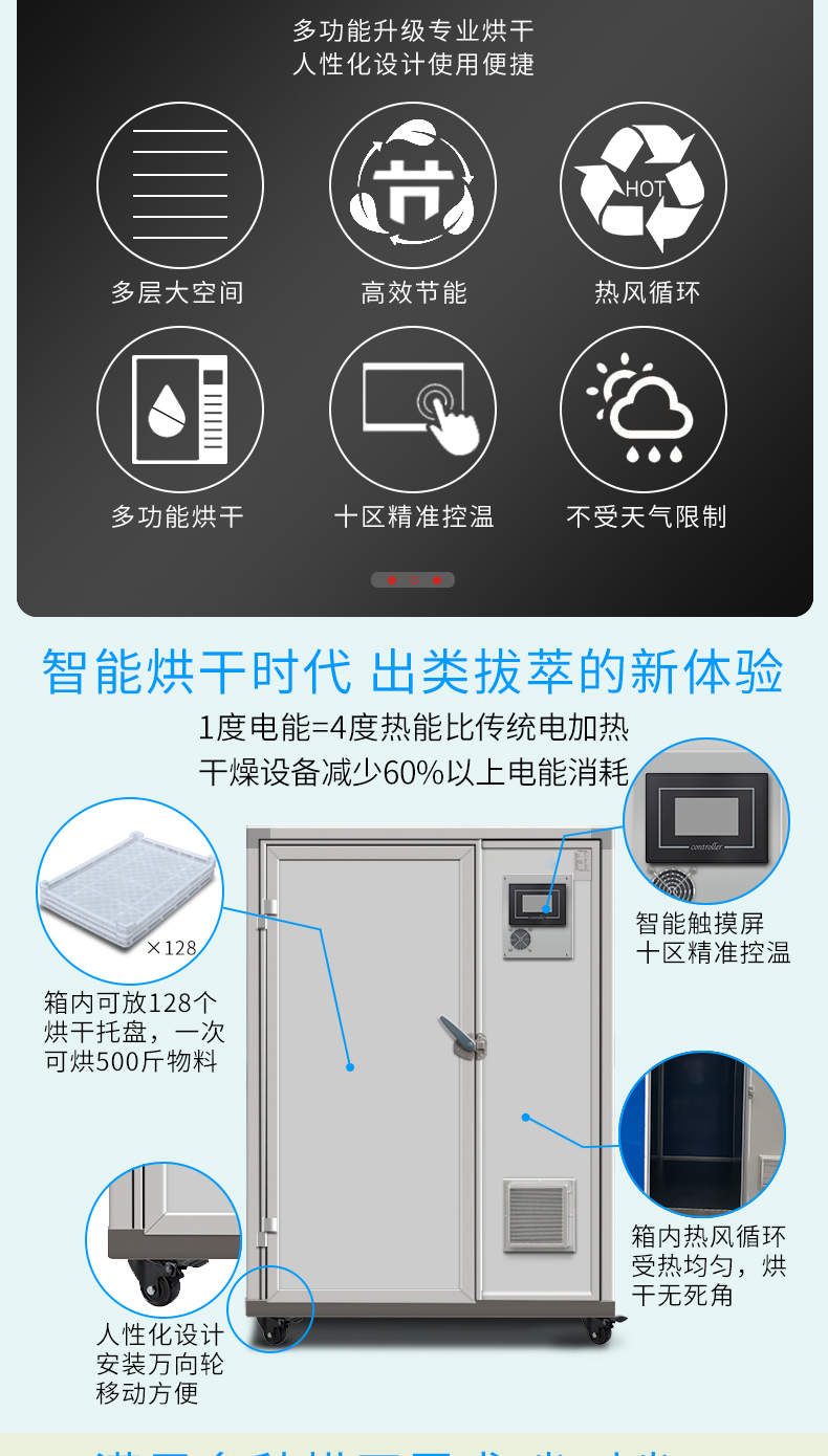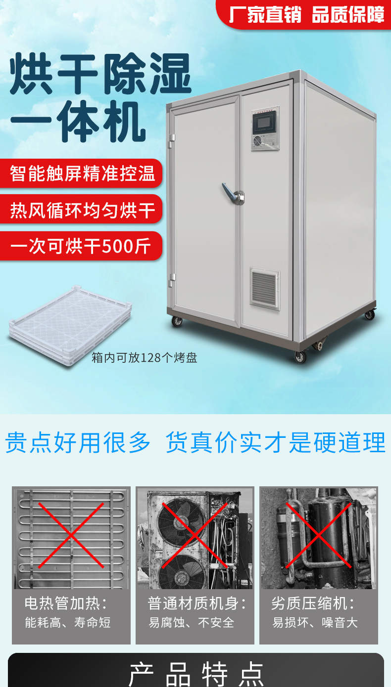 烘干除濕一體機(jī),烘干除濕體機(jī),智能觸屏精準(zhǔn)控溫?zé)犸L(fēng)循環(huán)均勻烘干次可烘干500斤,智能烘干時代出類拔萃的新體驗,1度電能=4度,熱能比傳統(tǒng)電加熱。干燥設(shè)備減少60%以上電能消耗。