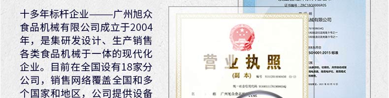 廣州旭眾食品機(jī)械有限公司是一家集科研開(kāi)發(fā),生產(chǎn)設(shè)計(jì),營(yíng)銷(xiāo)服務(wù)為一體的現(xiàn)代化生產(chǎn)企業(yè)。現(xiàn)代化生產(chǎn)車(chē)間,精湛制造技術(shù),所產(chǎn)機(jī)械歷經(jīng)市場(chǎng)重重考驗(yàn),不斷贏得海內(nèi)外客戶(hù)的贊譽(yù)。
