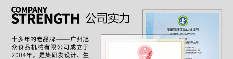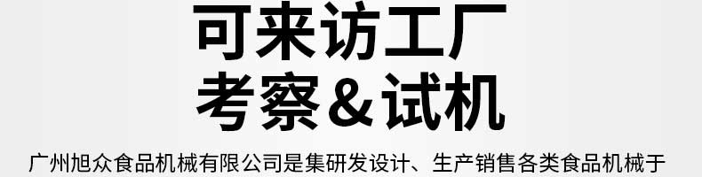 廣州旭眾食品機(jī)械有限公司是一家集科研開(kāi)發(fā),生產(chǎn)設(shè)計(jì),營(yíng)銷(xiāo)服務(wù)為一體的現(xiàn)代化生產(chǎn)企業(yè)?,F(xiàn)代化生產(chǎn)車(chē)間,精湛制造技術(shù),所產(chǎn)機(jī)械歷經(jīng)市場(chǎng)重重考驗(yàn),不斷贏得海內(nèi)外客戶(hù)的贊譽(yù)。