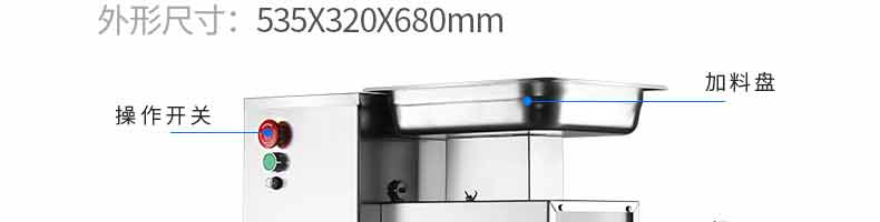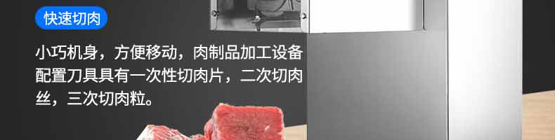 XZ-QX320-切肉機(jī),小型切肉機(jī)是一款主要對肉類進(jìn)行加工的設(shè)備,配置單層刀具一次性切肉片,二次切肉絲,再切成料。刀具采取外置懸臂式設(shè)計(jì),拆洗方便,衛(wèi)生更有保障;配置多種刀具,可加工不同厚度的肉片,實(shí)現(xiàn)一機(jī)多用;機(jī)內(nèi)裝有安全保護(hù)開頭,刀具外露時(shí),機(jī)器自鎖不能啟動,以保安全;卸下的刀具,不用清洗直接放置在6攝氏度以下的冰箱里,刀具余肉不發(fā)臭。刀片用特殊不銹鋼材料制造,經(jīng)久耐用。
