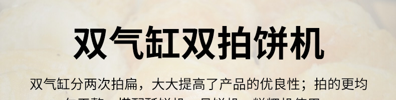 XZ-7200型雙拍餅機(jī),雙氣缸雙拍餅機(jī)雙氣缸分兩次拍扁,大大提高了產(chǎn)品的優(yōu)良性;拍的更均勻平整。搭配酥餅杋、月餅機(jī)、糍粑機(jī)使用。告別手工、更高效率。讓拍餅機(jī)改變生活,降低手工成本,省去繁瑣的手工工序,提高生活品質(zhì)。