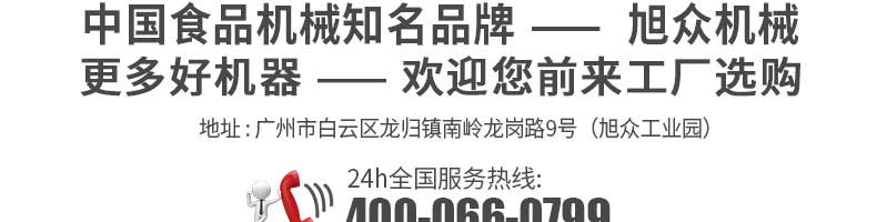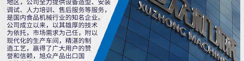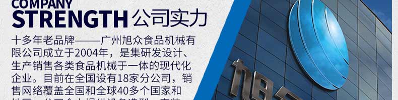 廣州旭眾食品機(jī)械有限公司是一家集科研開(kāi)發(fā),生產(chǎn)設(shè)計(jì),營(yíng)銷服務(wù)為一體的現(xiàn)代化生產(chǎn)企業(yè)?,F(xiàn)代化生產(chǎn)車間,精湛制造技術(shù),所產(chǎn)機(jī)械歷經(jīng)市場(chǎng)重重考驗(yàn),不斷贏得海內(nèi)外客戶的贊譽(yù)。