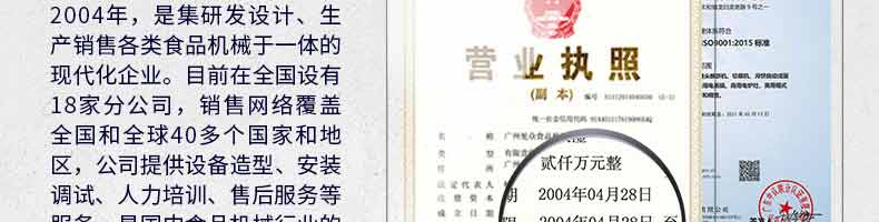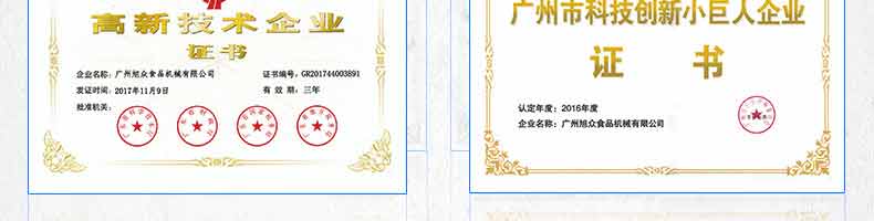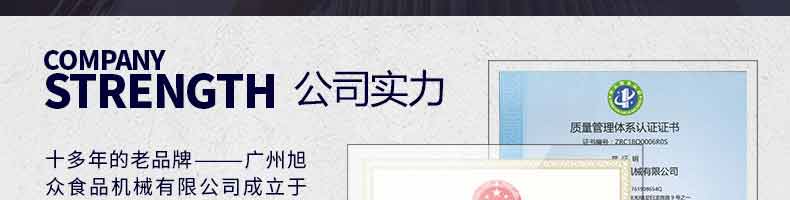廣州旭眾食品機(jī)械有限公司是一家集科研開發(fā),生產(chǎn)設(shè)計,營銷服務(wù)為一體的現(xiàn)代化生產(chǎn)企業(yè)?,F(xiàn)代化生產(chǎn)車間,精湛制造技術(shù),所產(chǎn)機(jī)械歷經(jīng)市場重重考驗,不斷贏得海內(nèi)外客戶的贊譽。