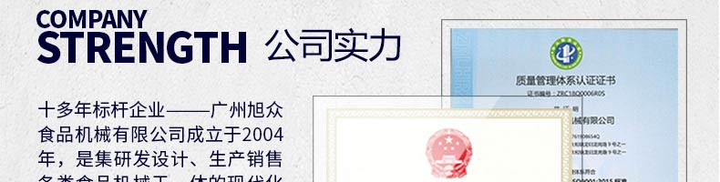 廣州旭眾食品機械有限公司是一家集科研開發(fā),生產設計,營銷服務為一體的現代化生產企業(yè)?,F代化生產車間,精湛制造技術,所產機械歷經市場重重考驗,不斷贏得海內外客戶的贊譽。